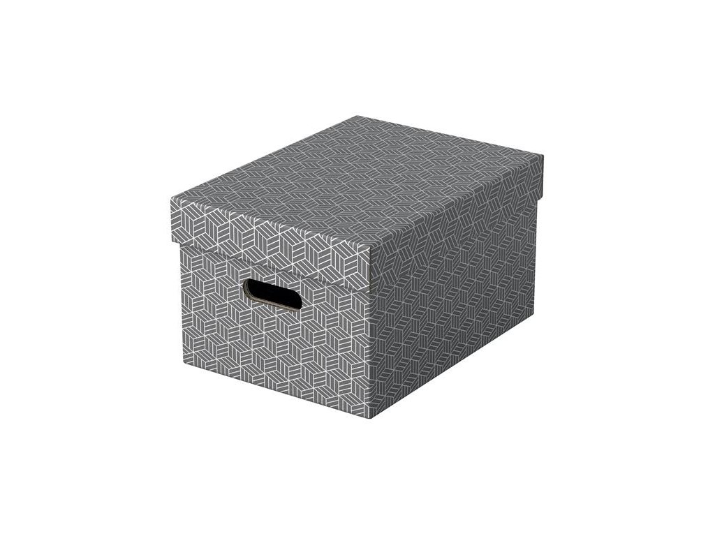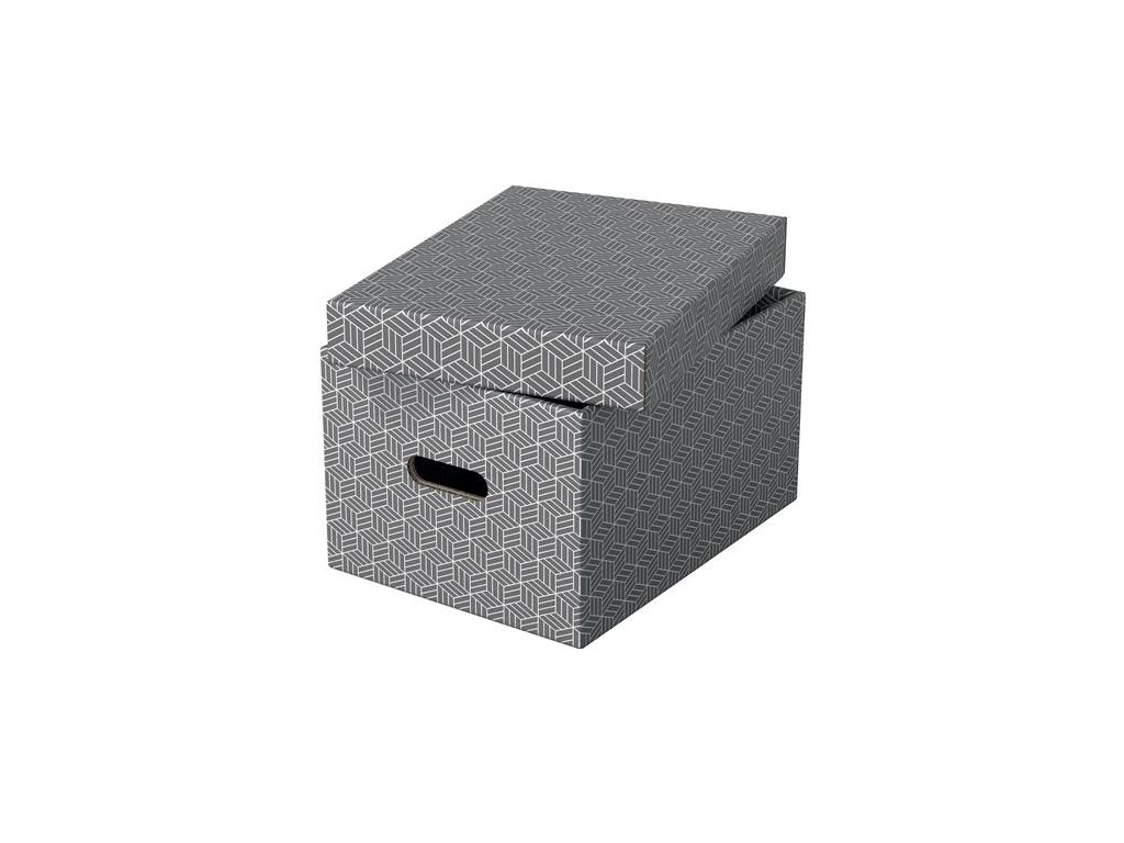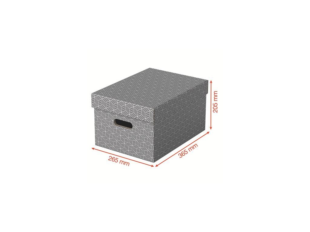 Súprava troch stredných lepenkových úložných boxov s moderným a štýlovým geometrickým dizajnom. Ideálne na ukladanie dokumentov, hračiek, kníh a ďalších drobností. Možno používať samostatne alebo uložiť na policu. Vďaka úchytom ich môžete podľa potreby ľahko prenášať z miestnost do miestnosti. Odnímateľné veko skryje obsah a ochráni ho pred prachom. Neutrálne farby a dizajn doplnia akýkoľvek štýl vybavenia. Dodávajú sa zabalené naplocho a dajú sa rýchlo a ľahko zostaviť. Steny sa pri zostavovaní preložia cez seba, takže sú dvojnásobne pevné. Povrch možno utrieť. Vyrobené z pevnej a odolnej 100% recyklovanej a 100% recyklovateľnej vlnitej lepenky s certifikáciou FSC Obal je 100% recyklovaný a 100% recyklovateľný bez obsahu plastov. Rozmery: 265 mm x 205 mm x 365 mm Značka: ESSELTE Výrobca: Esselte Kft. Adresa: 1139 Budapest, Lomb u. 37-39. A ép. II. 8., Hungary Web: https://www.accobrands.com/brands/ Email: hungarymarketing@acco.comDodatočné parametre