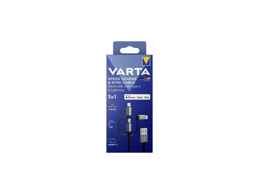VARTA má široký sortiment nabíjacieho príslušenstva vrátane káblov, adaptérov, autonabíjačiek a ďalších! Spájajú v sebe spoľahlivý výkon a najnovšie technologické trendy, ktoré sú primárne zamerané na uľahčenie každodenného života spotrebiteľa. -3 konektory v jednom kábli: USB-A - Micro-USB, USB-C, Lightning -odolné materiály: Nylon a hliník -dĺžka kábla: 2 m -výkon: 12W -prenos dát až 480 Gbit/sDodatočné parametre