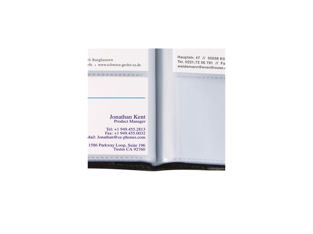 štýlový, elegantný dizajn 20 ks priehľadných listov kapacita: max. 192 ks vizitiek rozmeru 90x58 mm Značka: SIGEL Výrobca: SIGEL GmbH Adresa: Baeumenheimer Strasse 10, 86690 Mertingen, Germany Web: www.sigel-office.com Email: sandra.geist@sigel.deDodatočné parametre