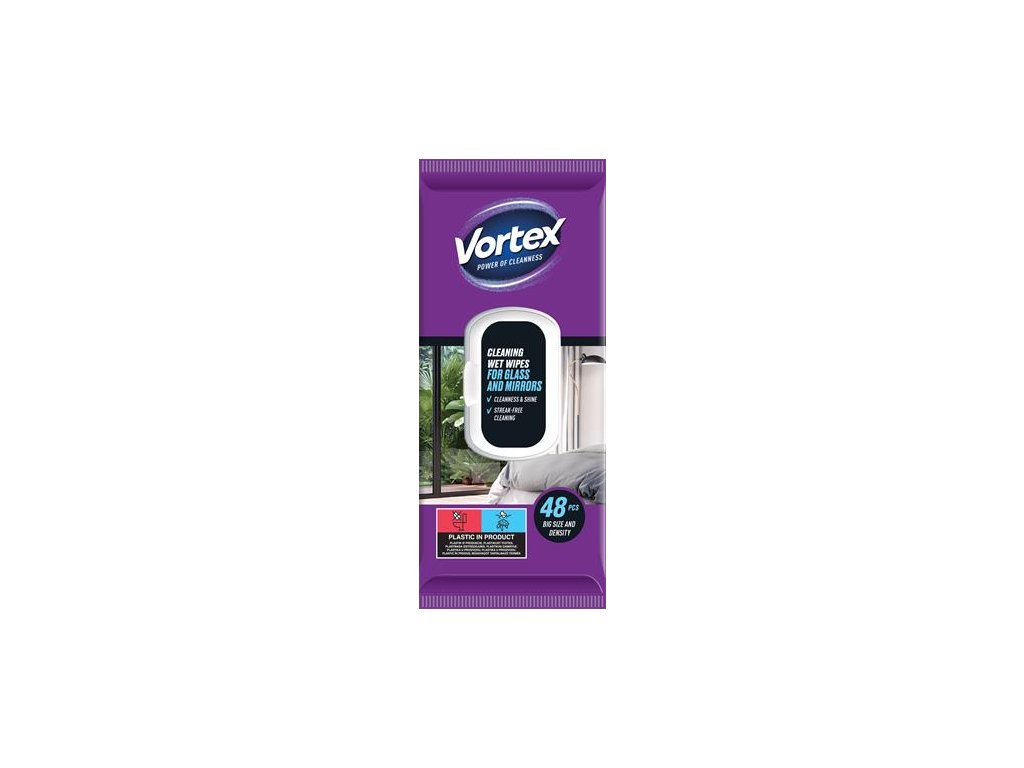 Vlhčené utierky, na sklenené a zrkadlové povrchy, s uzatvárateľným viečkom, 48 ks, VORTEX