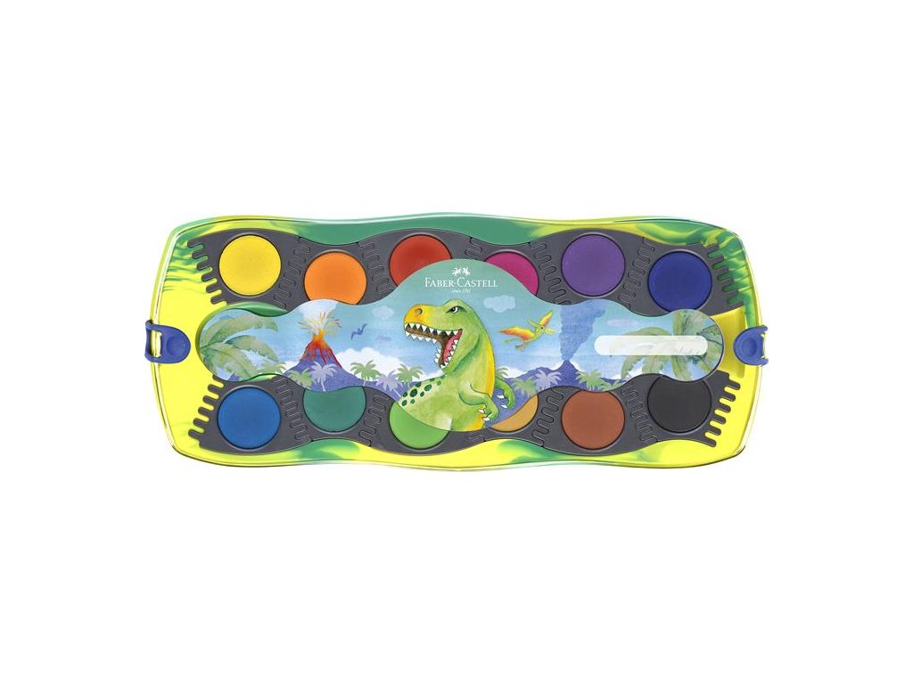 Vodové farby, 12-kusové, skladacie, FABER-CASTELL "Dinosaurus" + 1 tuba bielej temperovej farby + nálepky dinosaura