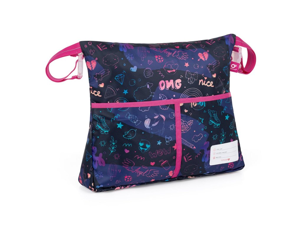 Jedno veľké a dve menšie vrecká sú určené na uschovanie drobností každého školáka (vodové farby a iné školské pomôcky). Horné veľké vrecko je uzatvárateľné na zips, dve bočné vrecká sú voľne prístupné. Vrecko je opatrené menovkou a popruhmi s prackami pre uchytenie k lavici.