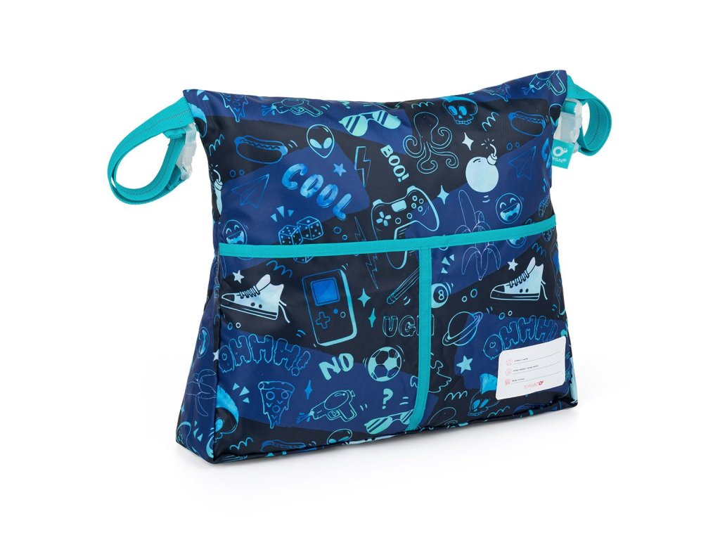 Jedno veľké a dve menšie vrecká sú určené na uschovanie drobností každého školáka (vodové farby a iné školské pomôcky). Horné veľké vrecko je uzatvárateľné na zips, dve bočné vrecká sú voľne prístupné. Vrecko je opatrené menovkou a popruhmi s prackami pre uchytenie k lavici.