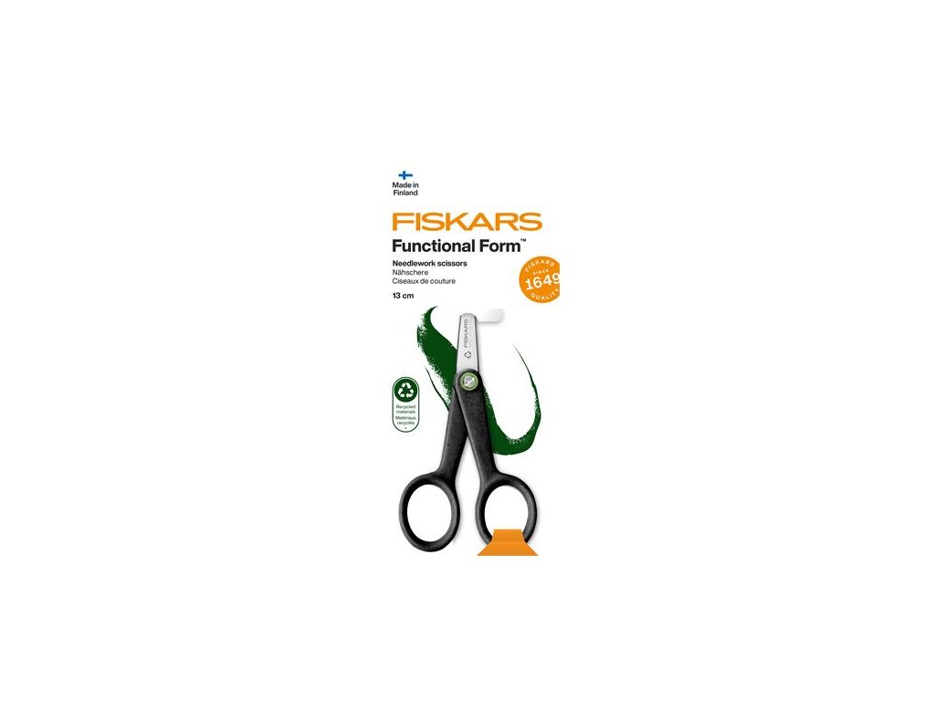 - Vyšívacie nožnice Fiskars Functional Form ReNew sú vyrobené z recyklovaných materiálov (minimálne 70 %) a poskytujú maximálny komfort a strihací výkon