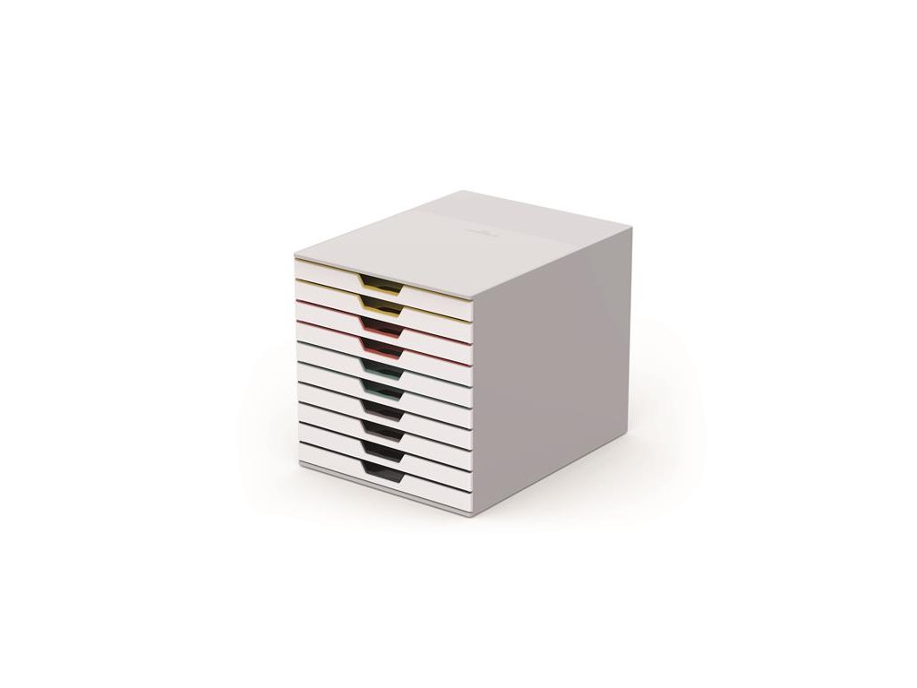 - elegantný, inovatívny zásuvkový box, 10 farebných zásuviek - z plastu prémiovej kvality - farebne odlíšené zásuvky pre lepšiu organizáciu dokumentov - zásuvky sa otvárajú ľahko a ticho - pre formáty A4, C4 a obálky - dodávané s priehľadnými držiakmi štítkov pre ľahký popis - stohovateľný, s protišmykovými nožičkami - rozmery: 280 x 292 x 356 mmDodatočné parametre
