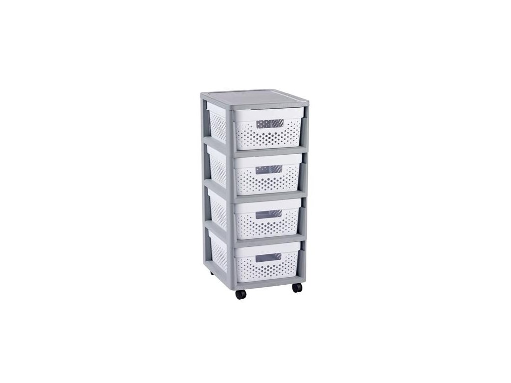 Úložná skriňa Infinity so zásuvkami je multifunkčné úložné riešenie, ktoré nájde využitie v každej miestnosti, kde je potrebný extra úložný priestor a plne uspokojí potreby zákazníkov, ktorí preferujú funkčnosť a estetický vzhľad. Má 4 výsuvné šuplíky, šuplíky sa dajú jednoducho vysunúť pomocou šikovných úchytiek a vďaka 4 kolieskam umiestneným v spodnej časti skrine sa dá odkladacia skrinka jednoducho premiestniť. - multifunkčné úložné riešenie so 4 zásuvkami - moderný dizajn inšpirovaný škandinávskym štýlom - pohodlné madlá - jednoduché presúvanie, vybavené 4 kolieskami - jednoduché čistenie - šetrné k životnému prostrediu, vyrobené z minimálne 70% recyklovaného plastu - rozmery: 300 x 360 x 690 mm - kapacita: 4x11 litrov - farba: strieborná, bielaDodatočné parametre