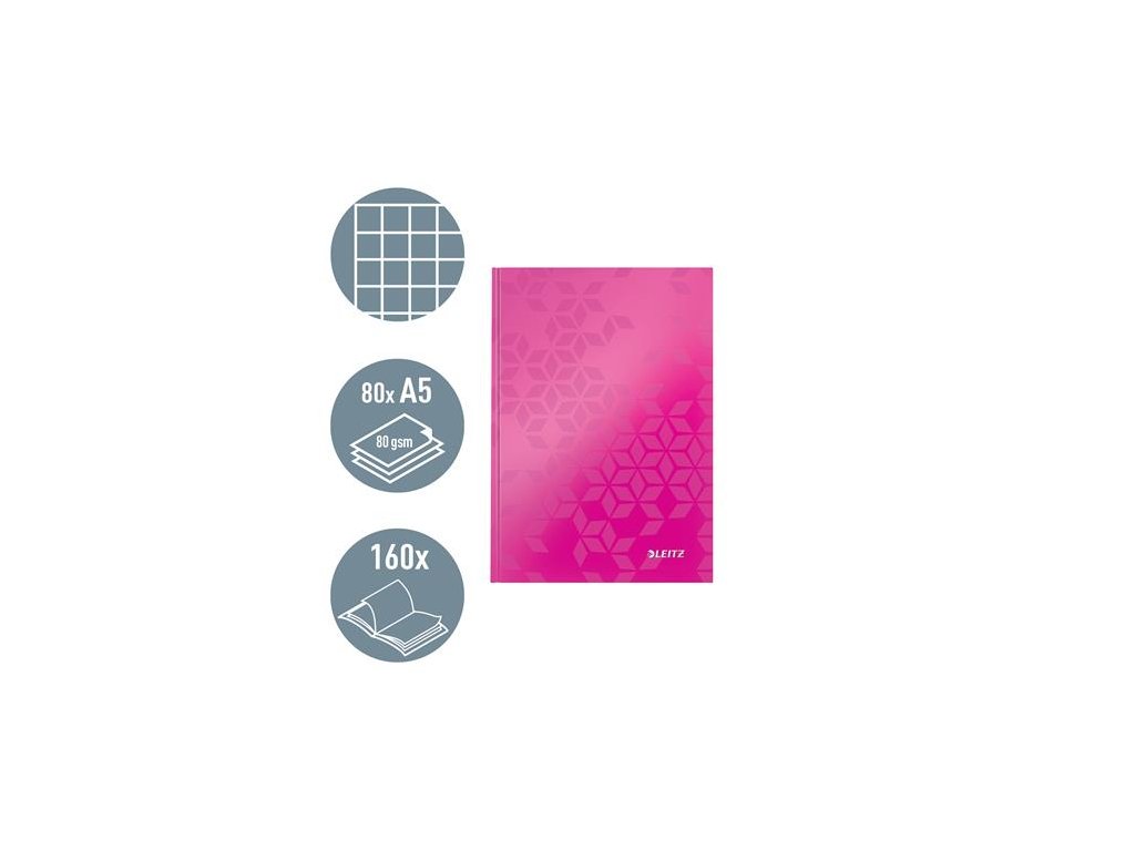Záznamová kniha, A5, štvorčeková, 80 listov, tvrdá obálka, LEITZ "Wow", ružová