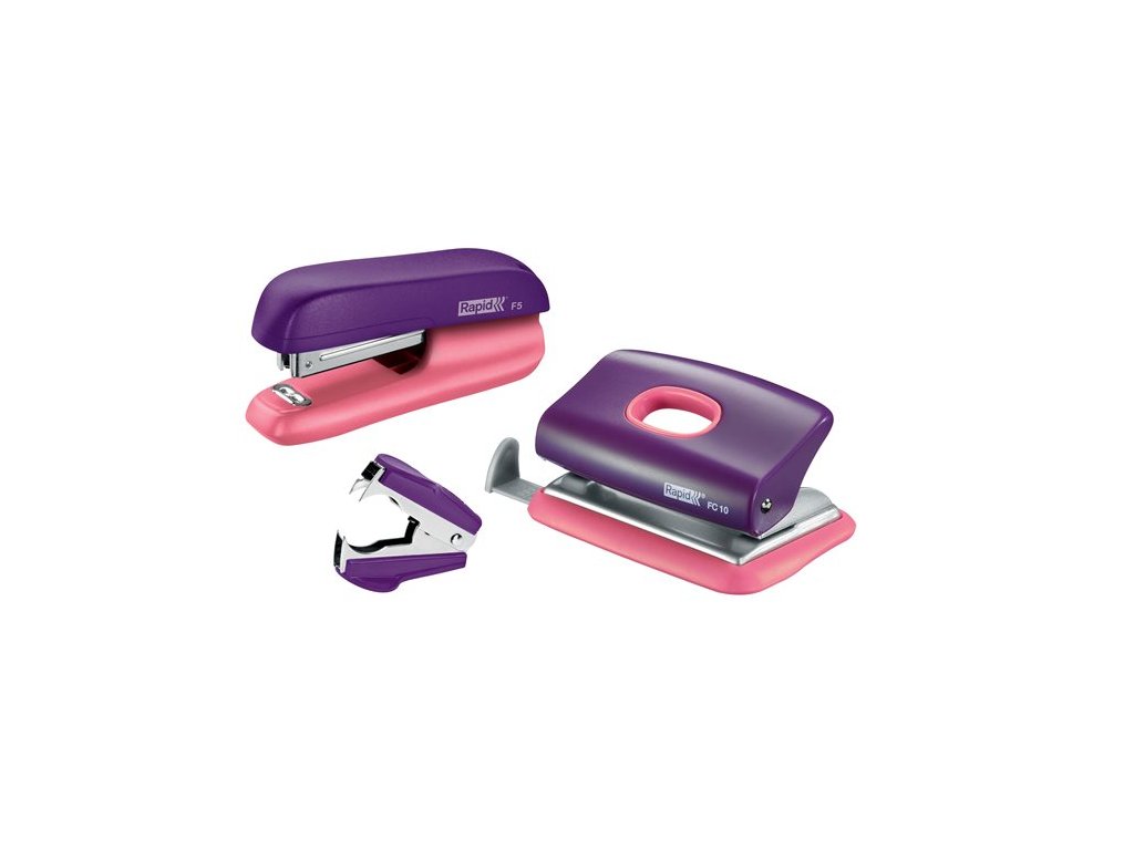 Zošívačka, dierovačka, rozošívačka, sada, 10 listov, RAPID "F5 Mini", fialová/broskyňová