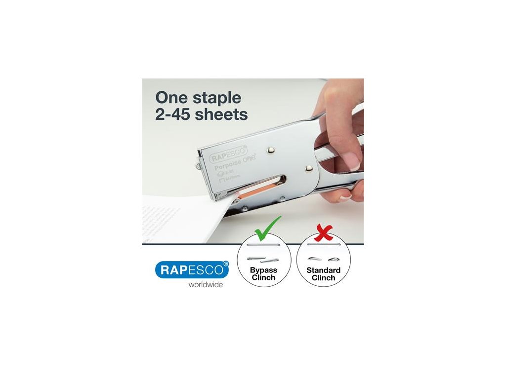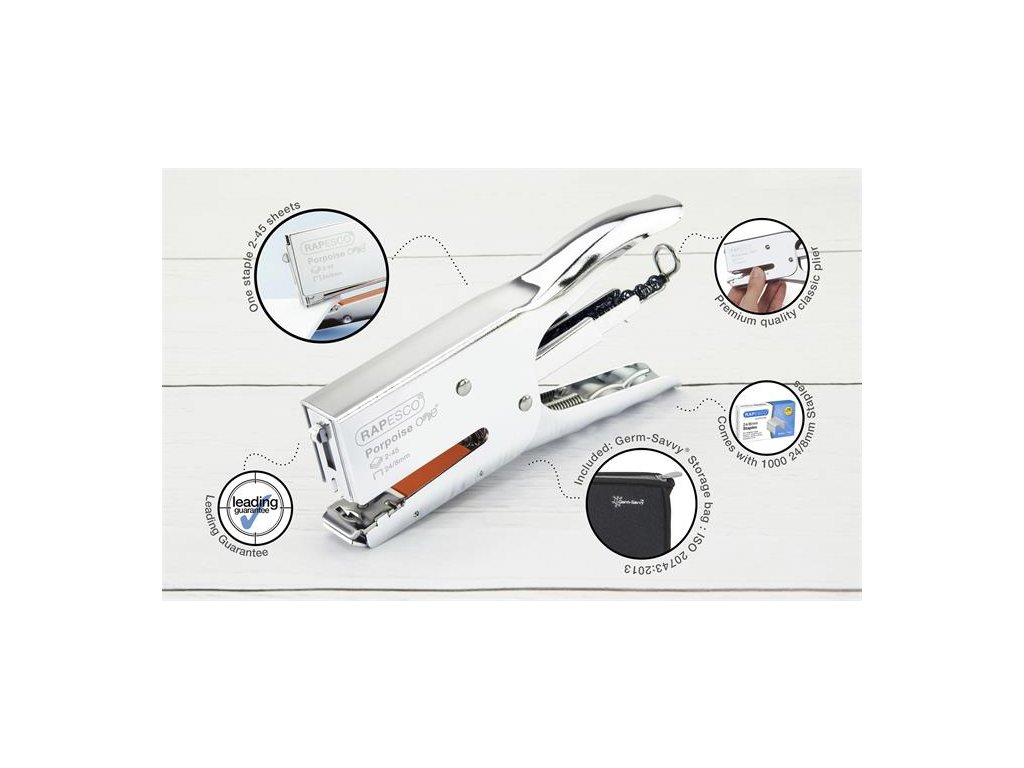 Zošívačka Rapesco Porpoise ONE, ideálna na rýchle zošívanie a balenie - oblasti použitia: pošta, stravovacie zariadenia, sklady a iné priestory - ručná zošívačka - odolné kovové telo, kovová konštrukcia - zadné plnenie, možno znovu nabiť zatlačením alebo vyháknutím zadnej pružiny - kapacita listov: 2- 45 listov (80g/ms) - spinky: 24/8 mm - darčekové spinky: áno 1000 Rapesco 24/8mm - ergonomický dizajn - rozmer: 175 mm x 22 mm x 92 mm - dodávané v antibakteriálnom puzdre - záruka: 15 rokov Značka: RAPESCO Výrobca: Rapesco-Tacwise BV Adresa: Kraijenhoffstraat, 137A, 1018RG Amsterdam, Netherlands Web: www.rapesco.com Email: support@rapesco-tacwise.nlDodatočné parametre
