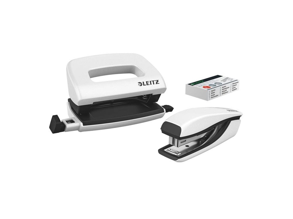 Zošívačka a dierovačka, set, 10 listov, kovový, LEITZ "Wow Mini", biela