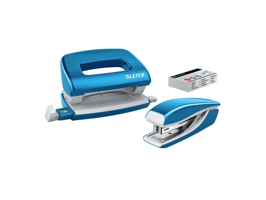 Zošívačka a dierovačka, set, 10 listov, kovový, LEITZ "Wow Mini", modrá