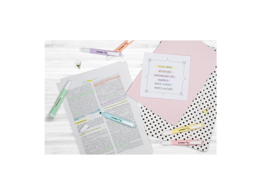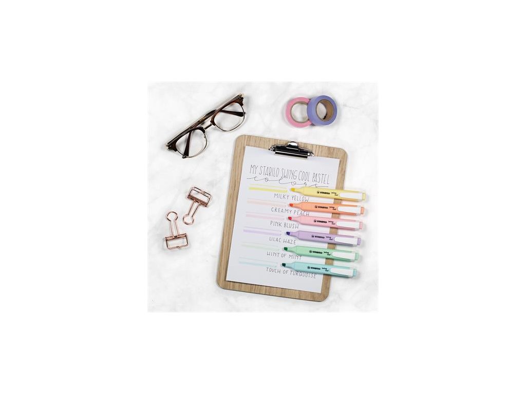 Kolekcia STABILO swing cool Pastel je ideálnou voľbou pre všetkých, ktorí chcú vyniknúť z davu jemnými, elegantnými doplnkami. - zvýrazňovače prémiovej kvality - pastelové farby - atrament na báze vody - intenzívne potiahnuté farby - zrezaný hrot (1-4 mm) - telo pera rovnakej farby ako atrament - dĺžka písania: 350 m - balenie: 6 kusov / balenie Značka: STABILO Výrobca: STABILO international GmbH Magyarországi Fióktelepe Adresa: 1033 Budapest, Szőlőkert köz 7/a., Hungary Web: www.stabilo.hu Email: info.hu@stabilo.comDodatočné parametre