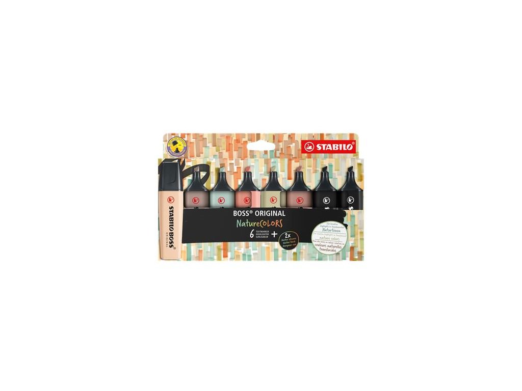 Zvýrazňovač, sada, 2-5 mm, STABILO "BOSS original NatureColors", 6 rôznych farieb + 2 čierna