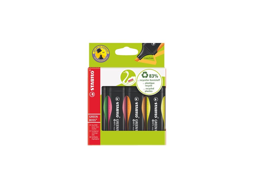 Zvýrazňovač, sada, 2-5 mm, STABILO "Green Boss", 4 rôzne farby