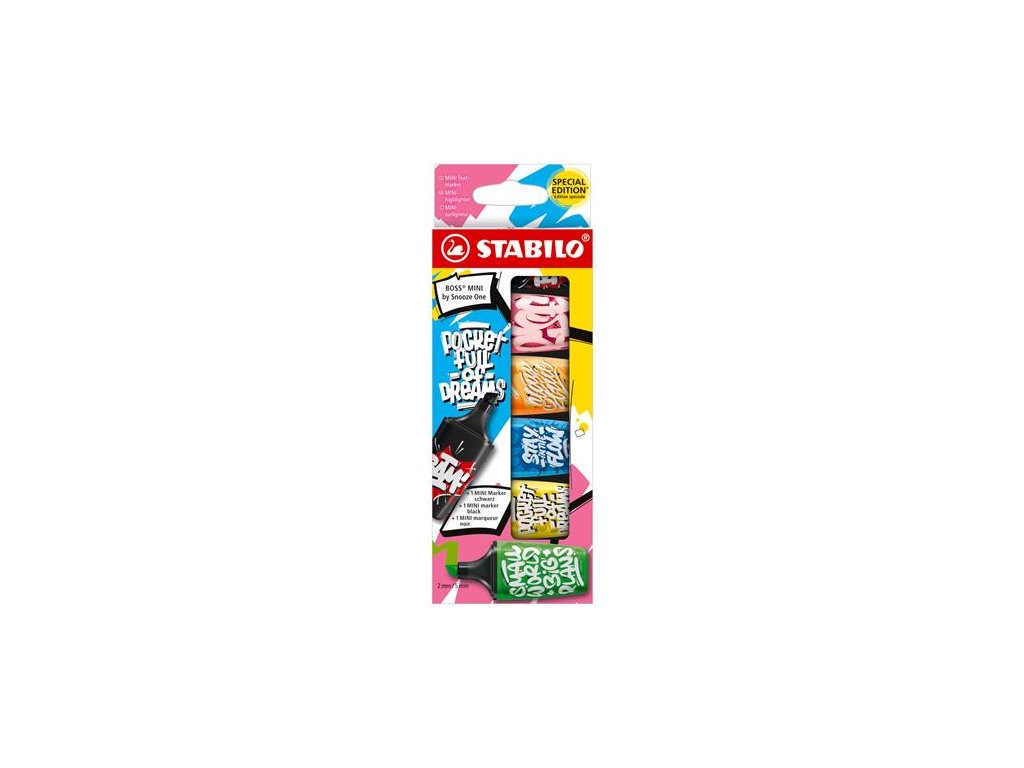 - STABILO "Boss Original" zvýrazňovač s bežným výkonom - vďaka technológii proti vysušeniu nevyschne až 4 hodiny bez viečka - hrúbka písma 2-5 mm - atrament na vodnej báze - farby v sade: čierna, ružová, oranžová, modrá, žltá, zelená Značka: STABILO Výrobca: STABILO international GmbH Magyarországi Fióktelepe Adresa: 1033 Budapest, Szőlőkert köz 7/a., Hungary Web: www.stabilo.hu Email: info.hu@stabilo.comDodatočné parametre